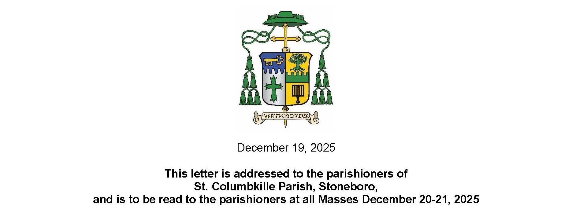 This letter is addressed to the parishioners of St. Columbkille Parish, Stoneboro, and is to be read to the parishioners at all Masses December 20-21, 2025