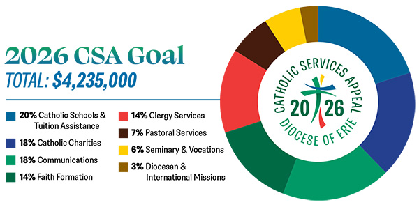 The Catholic Services Appeal (CSA) is the Diocese of Erie’s annual fundraising campaign, uniting the faithful across all 13 counties in a shared mission of faith and service. It serves as a powerful reminder that we are one Catholic family, working together to support the vital ministries and initiatives that bring Christ’s love to our communities.